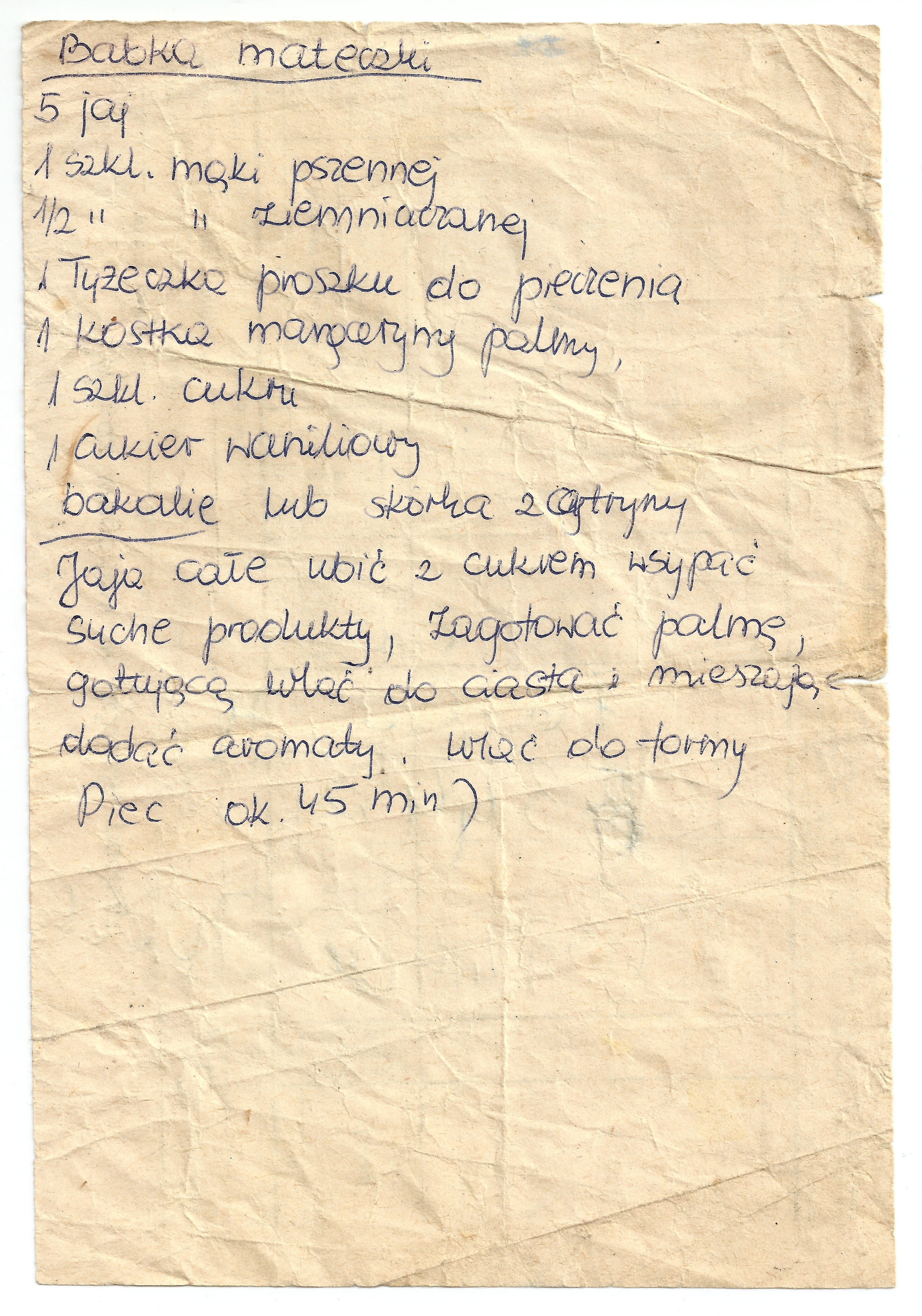 Jaja całe ubić z cukrem, wsypać suche produkty; zagotować margarynę, gotującą wlać do ciasta i mieszając dodać aromaty. Wlać do formy. Piec około 45 minut.