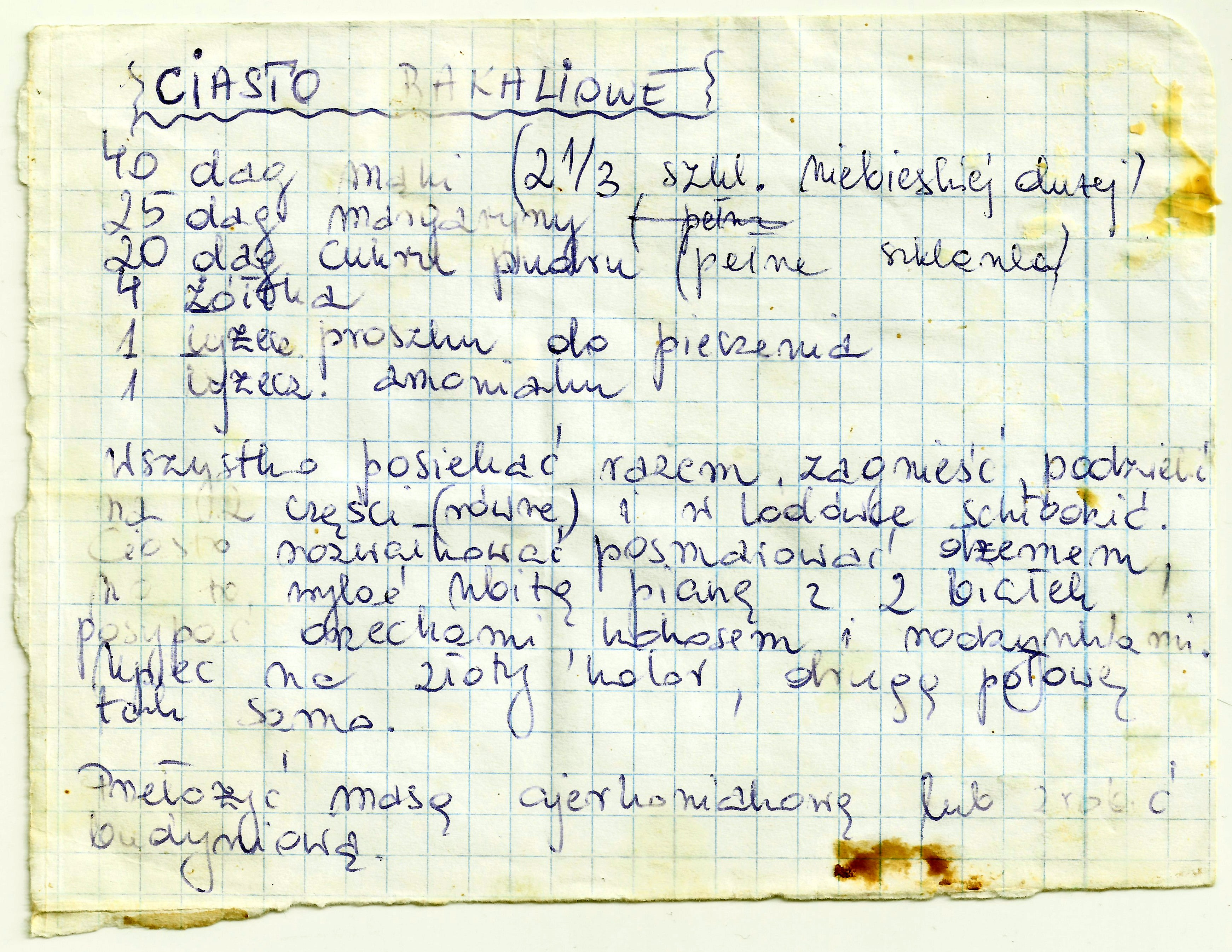 Wszystko posiekać razem, zagnieść, podzielić na 2 równe części i schłodzić w lodówce. Ciasto rozwałkować, posmarować dżemem, na to wylać ubitą pianę z dwóch białek, posypać orzechami, kokosem i rodzynkami. Upiec na złoty kolor, drugą połowę tak samo. Przełożyć masą ajerkoniakową lub zrobić budyniową.