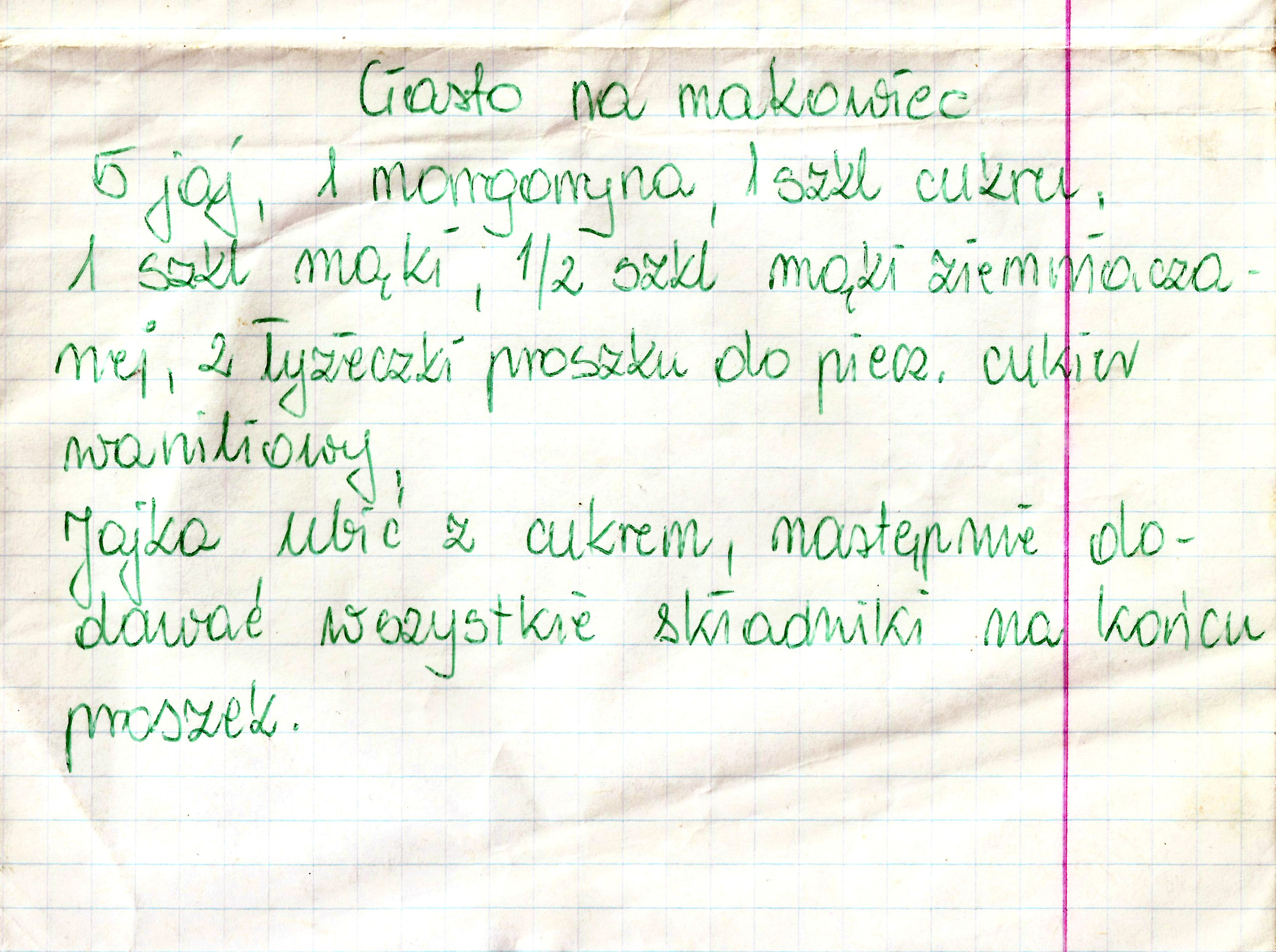 Jajka ubić z cukrem, następnie dodawać wszystkie składniki, na końcu proszek do pieczenia.