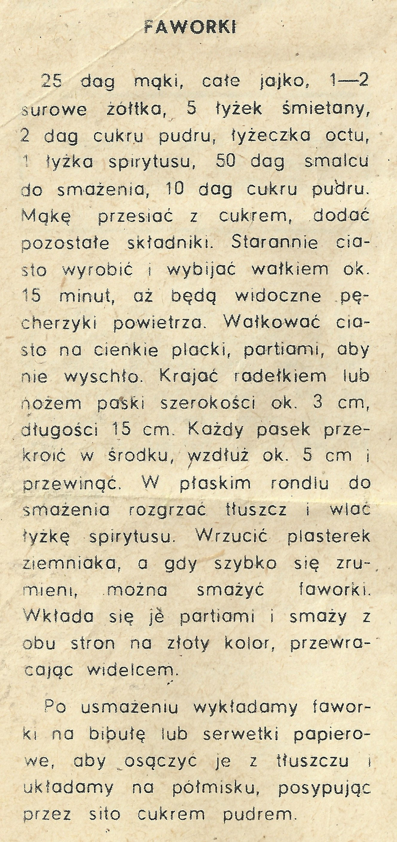 Mąkę przesiać z cukrem, dodać pozostałe składniki. Starannie ciasto wyrobić i wybijać wałkiem około 15 minut, aż będą widoczne pęcherzyki powietrza. Wałkować ciasto na cienkie placki, partiami, aby nie wyschło. Krajać radełkiem lub nożem paski szerokości około 3cm długości 15cm. Każdy pasek przekroić w środku, wzdłuż około 5cm i przewinąć. W płaskim rondlu do smażenia rozgrzać tłuszcz i wlać łyżkę spirytusu. Wrzucić plasterek ziemniaka, a gdy szybko się zrumieni, można smażyć faworki. Wkłada się je partiami i smaży z obu stron na złoty kolor, przewracajπc widelcem. Po usmażeniu wykładamy faworki na bibułkę lub serwetki papierowe, aby osączyć je z tłuszczu i układamy na półmisku, posypując przez sito cukrem pudrem.