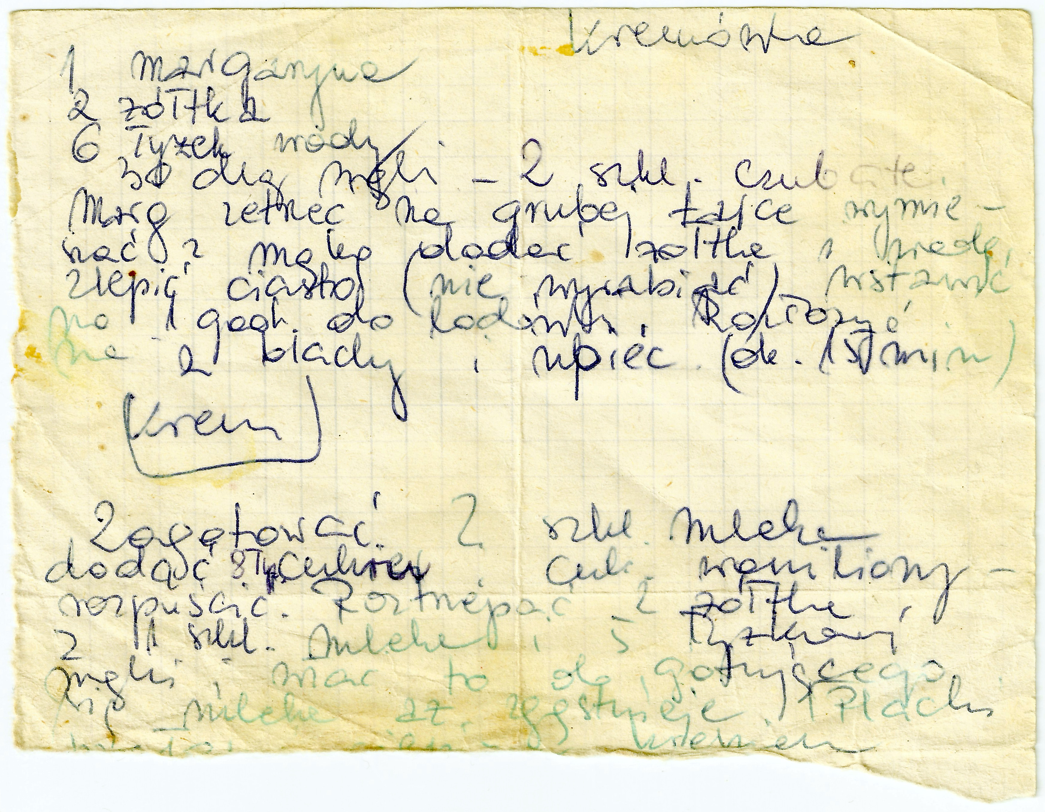 Zagotować 2 szklanki mleka, dodać 8 łyżek(?) cukru, cukier waniliowy - rozpuścić. Roztrzepać 2 żółtka z 1 szklanką mleka i 5 łyżkami mąki i wlać to do gotującego się mleka aż zgęstnieje. Placki (?).