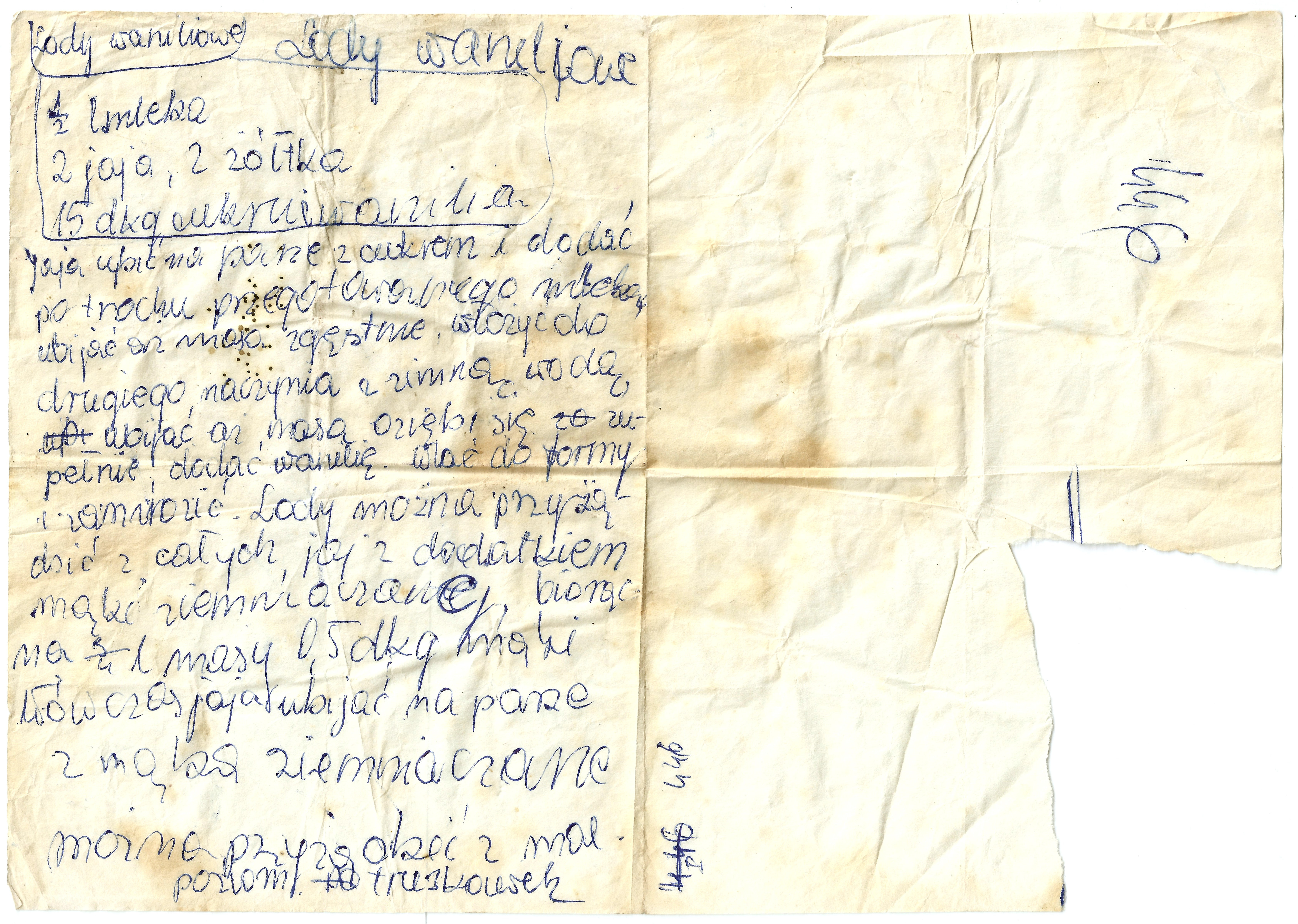 Jaja ubić na parzę z cukrem i dodać po trochu przegotowanego mleka, ubijać aż masa zgęstnie, włożyć do drugiego naczynia z zimną wodą. Ubijać aż masa oziębi się zupełnie, dodać wanilię. Wlać do formy i zamrozić. Lody można przyżądzić z całych jaj z dodatkiem mąki ziemniaczanej, biorąc na ¾l masy - 5g mąki. Wówczas jaja ubić na parzę z mąką ziemniaczaną.