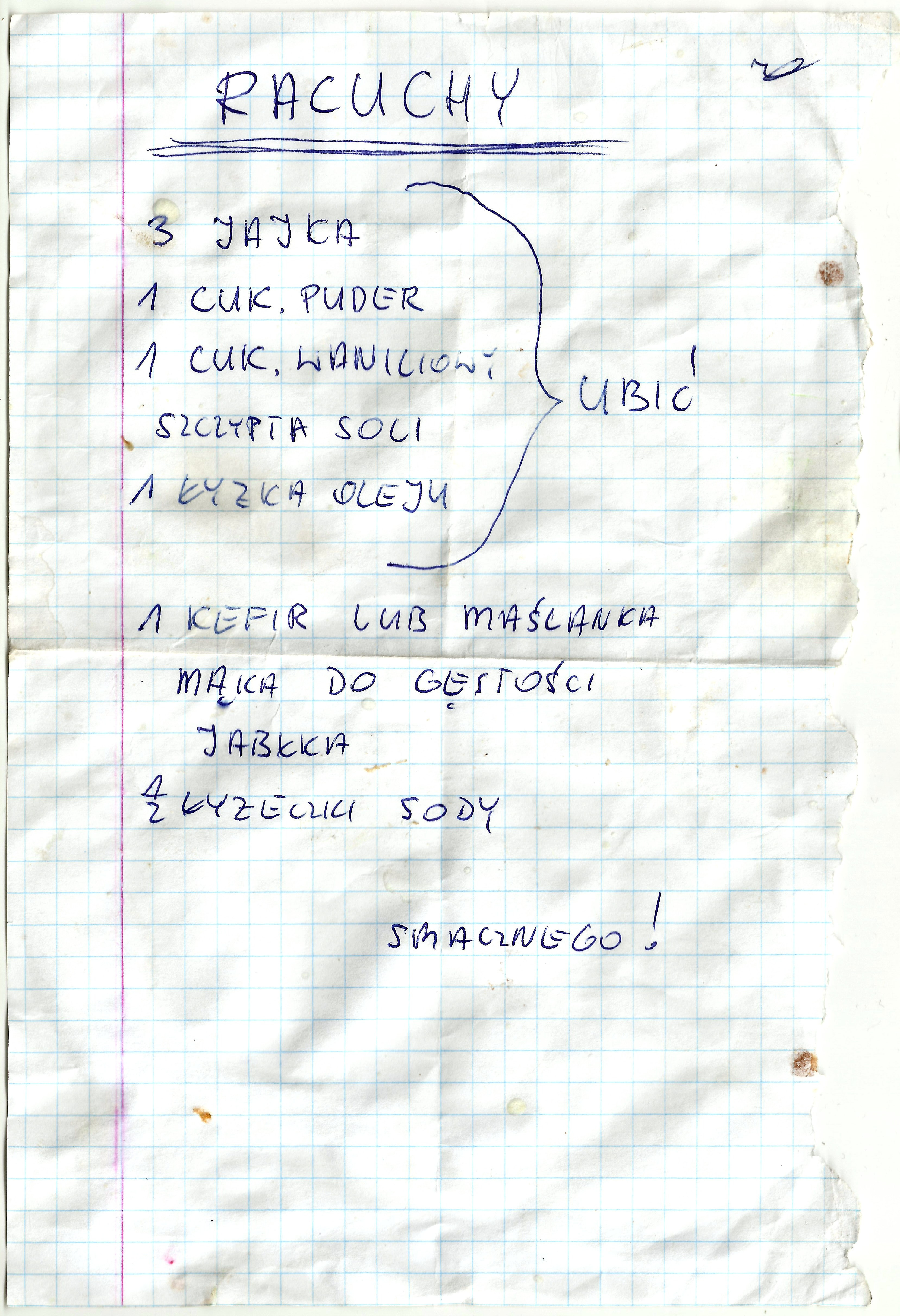 Jajka, cukier puder, cukier wanilinowy, sól i olej ubić mikserem. Dodać maślankę lub kefir, jabłka i sodę. Wszystko mieszać dodając mąki. Ciasto gęstością ma przypominać ciasto na naleśniki.