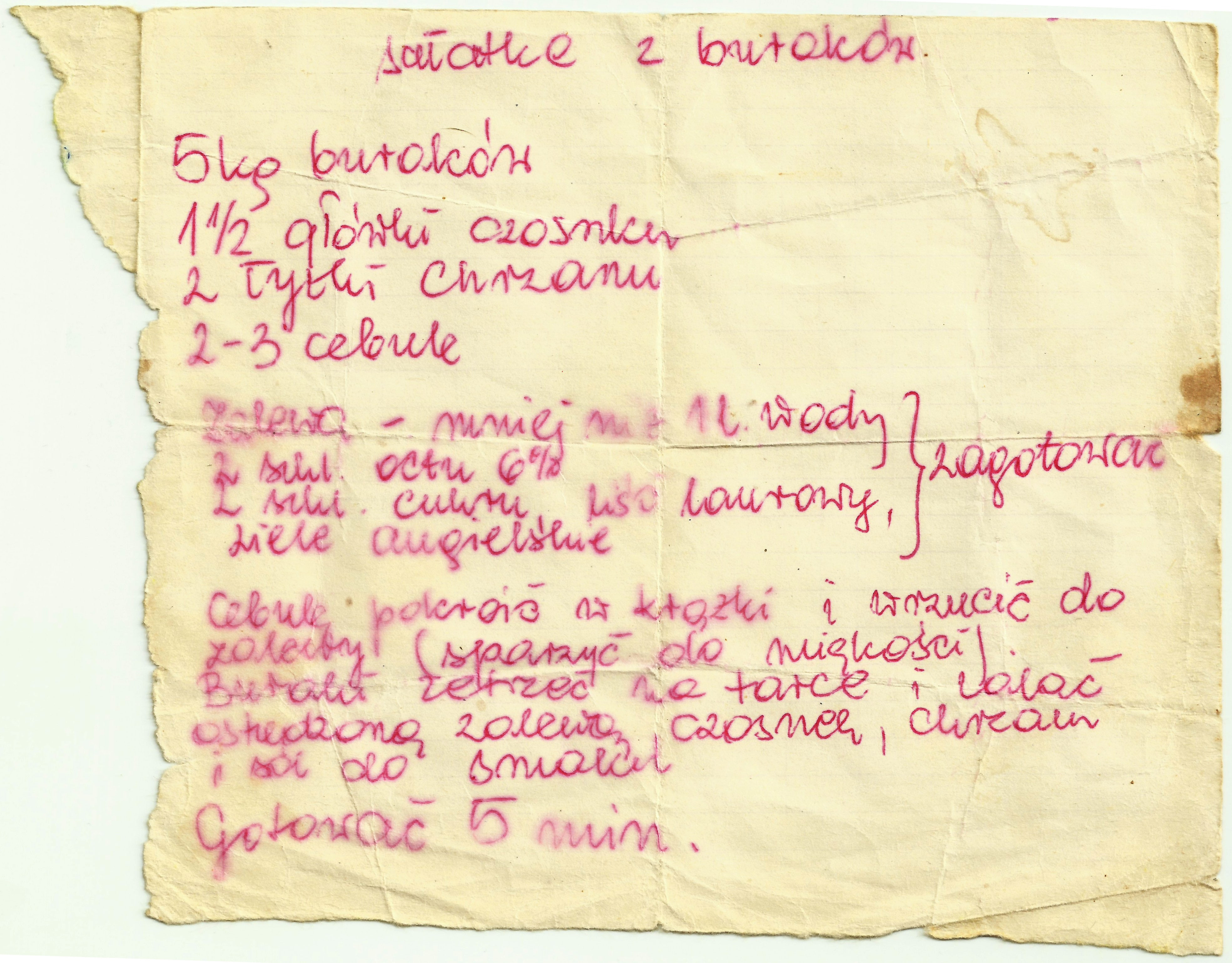 Cebule pokroić w krążki i wrzucić do zalewy (sparzyć do większości). Buraki zetrzeć na tarce i zalać ostudzoną zalewą; czosnek, chrzan i sól do smaku. Gotować 5 minut.